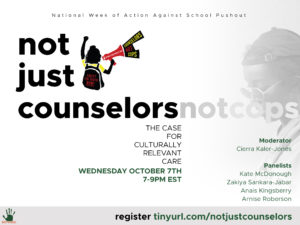 Welcome to our 11th Annual National Week of Action Against School Pushout. Our theme this year is Counselors Not Cops: Equity for Youth Now! Join us as DSC members and allies hold events and actions across the country.