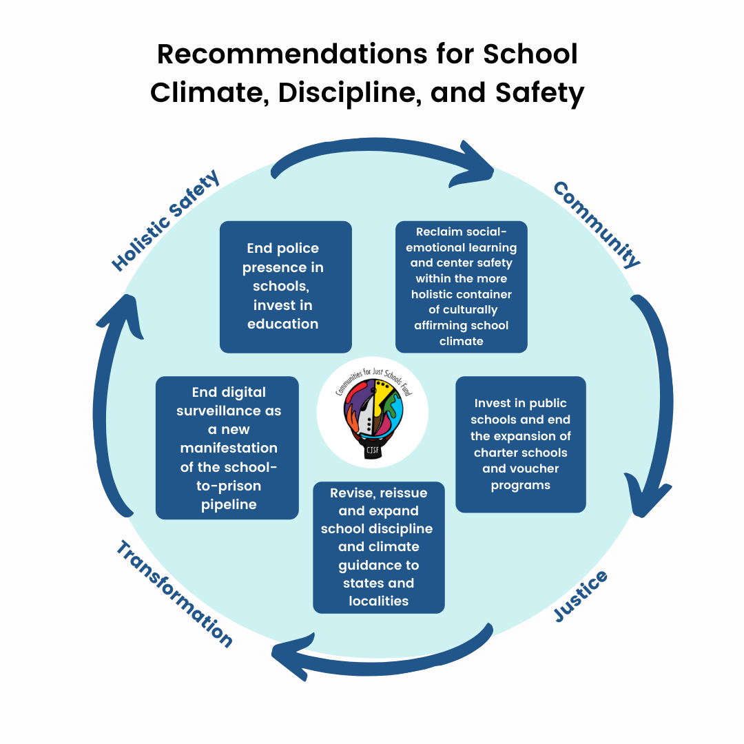 These recommendations are sent on behalf of the Communities for Just Schools Fund (CJSF). Our 60 partner organizations’ efforts to improve school discipline and climate and ensure holistic safety span more than 31 states and have positively impacted millions of students, parents and educators. They organize young people, parents and caregivers, educators, and others to advocate on behalf of students who are disproportionately impacted by the overuse of exclusionary school discipline and law enforcement interventions in and around schools. Their advocacy sheds light upon the fact that, in many places, there are far too many students who find themselves being policed and targeted for exclusion from their schools because of flawed policies and practices and biased perceptions of them and their communities. Their organizing has been crucial in illuminating the need for and value of meaningful engagement with young people and their families, the lack of which exacerbates negative perceptions.