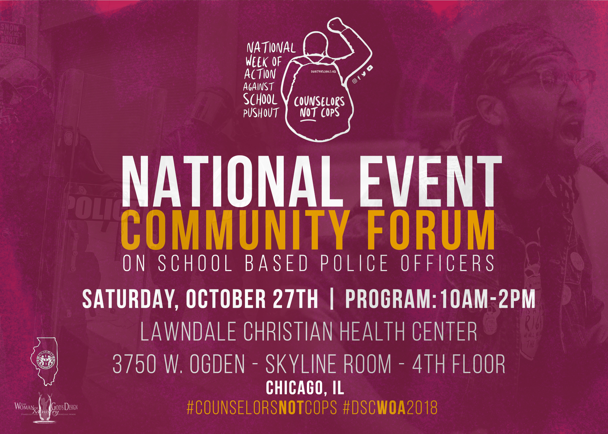Chicago, IL – ‘Parents Organized to Win, Educate, Renew- Policy Action Council’ (POWER-PAC) and The Woman of God’s Design Ministry in conjunction with the Dignity in Schools Campaign (DSC) are co-hosting a community forum on the issue of School-Based Police Officers in Chicago Public Schools, as part of the 9th Annual National Week of Action Against School Pushout.