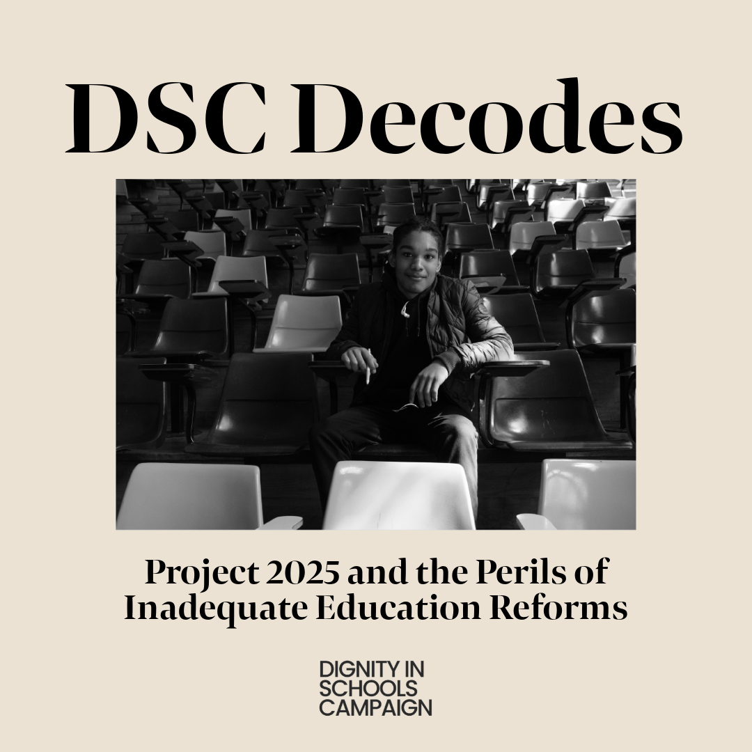 The Dignity in Schools Campaign (DSC) is excited to share our latest publication: DSC Decodes Project 2025 and the Perils of Inadequate Education Reforms This document digs into conversations around and adjacent to Project 2025—a policy blueprint from conservative think tanks with drastic proposals like dismantling the Department of Education, gutting protections for marginalized students, and funneling public dollars to private schools. DSC unpacks how these plans threaten to deepen inequalities, putting students’ rights and futures on the line. This report not only highlights what’s at stake but also calls for a powerful grassroots movement to build a public school system that truly serves every community, uplifting the voices of students, parents, and educators on the frontlines of the fight for educational justice.
