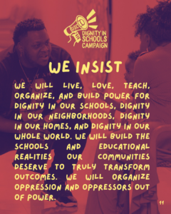 We insist that we will live, love, teach, organize, and build power for dignity in our schools, dignity in our neighborhoods, dignity in our homes, and dignity in our whole world. We will build the schools and educational realities our communities deserve to truly transform outcomes. We will organize oppression and oppressors out of power.