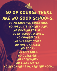 So of course there are no good schools, no meaningful education, no adequate teacher pay, no funding for SEL. No in-school medics, no counselors. No support staff. No music classes. No books. No libraries. No oversight. No community. No clean water. No affordable or healthy food. No decent jobs. No college without massive debt.